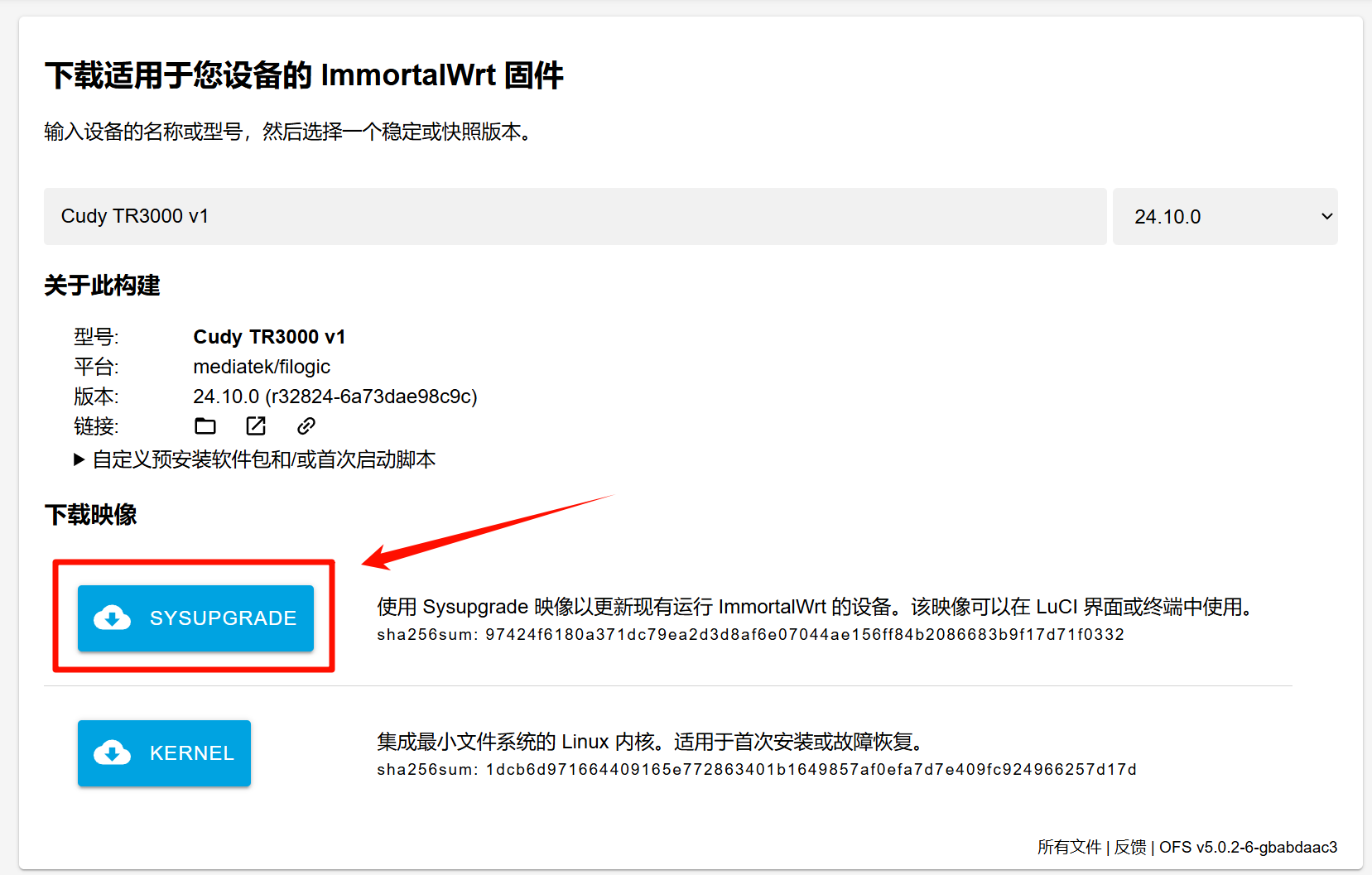 2) ImmortalWrt固件:immortalwrt-24.10.0-mediatek-filogic-cudy_tr3000-v1-squashfs-sysupgrade.bin 。如果要获取ImmotalWrt最新版本,可以在ImmortalWrt镜像网站搜索cudy tr3000,选择v1下载。